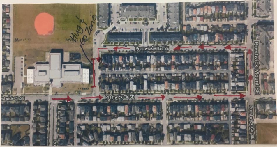 The Hug & Go zone is on the east end of the school on Prestwick Villas SE.